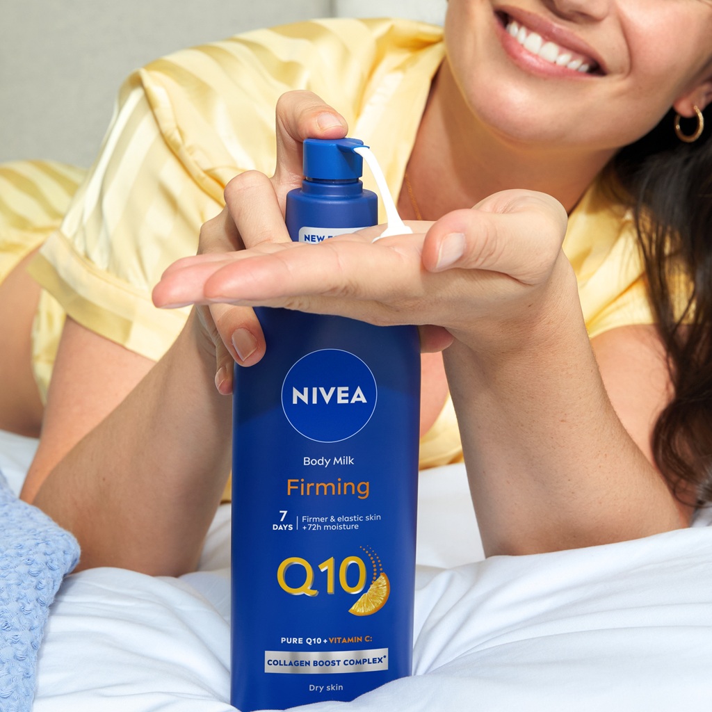 NIVEA’s skin-firming Q10 range is specially formulated to help visibly reduce the appearance of wrinkles and support skin elasticity while delivering moisture. NIVEA Skin Firming Body Cream with Q10 is a moisturizing cream for dry skin formulated with Q10 that helps to support skin elasticity and helps to deliver firmer skin in as little as two weeks with regular twice daily use.