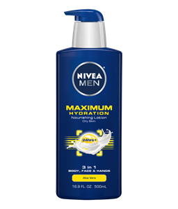 For men, NIVEA MEN Maximum Hydration Nourishing Lotion is a 3-in-1 lotion for body, face, and hands especially formulated for men that intensively moisturizes skin for 24+ hours and absorbs in seconds.