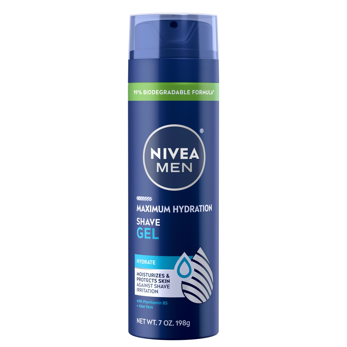 NIVEA MEN Maximum Hydration Shave Gel with 99% biodegradable formula, Provitamin B5, and Aloe Vera softens facial hair and improves razor glide. This formula provides a gentle close shave, protecting the skin from micro cuts and shave irritation.