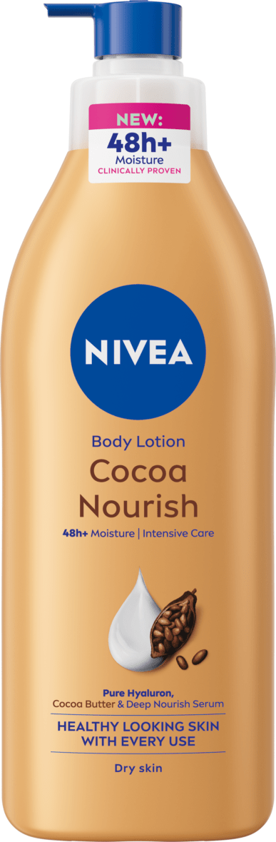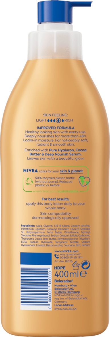 NEW FORMULA Healthy looking skin with every use. Deeply nourishes for 72h. For noticeably soft, radiant & smooth skin. Enriched with Hyaluronic Acid, Cocoa Butter & Deep Nourishing Serum. Leaves skin with a beautiful glow.